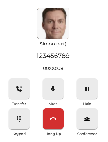 Mobex UC will automatically open, and the call will be in progress on this screen. You can then use MobeX UC as usual to hold and transfer calls. Refer to the MobeX UC manual for full details. |
