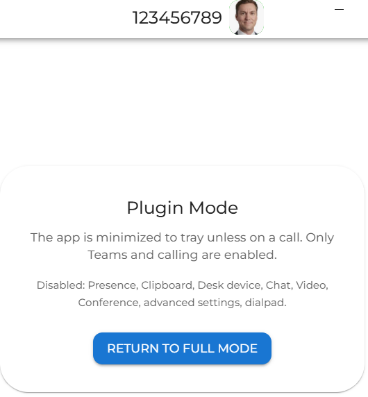 Likewise, once you are in the full MobeX mode you can again return to the Teams plugin by clicking your avatar and going to the system settings