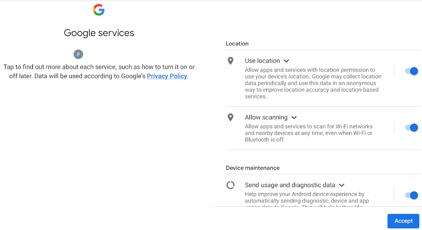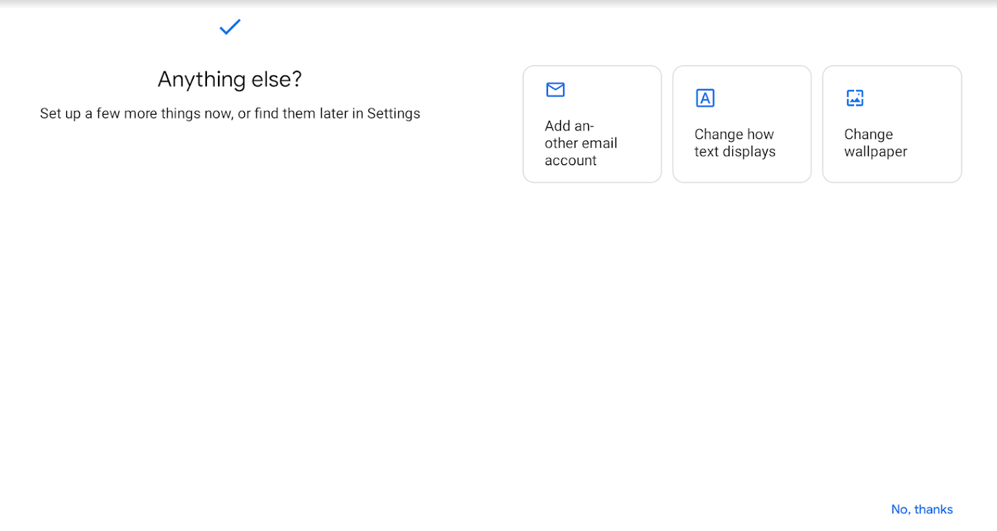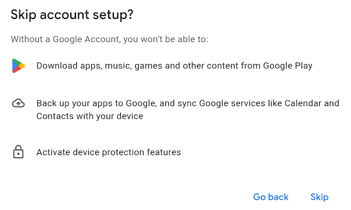 Again, we highly recommend that you do not copy any apps, photos, contacts or Google account information over. The tablet will have access from the cloud instead.