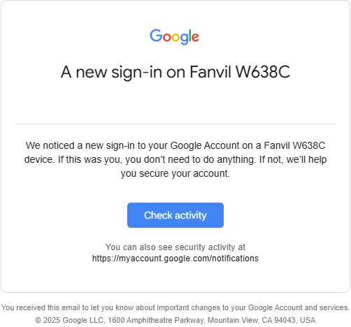 You will receive a Google alert email warning that you have signed in on another device. Our hardware partner is Fanvil, and the expected hardware sign-in device is the model number W638 or W638C.