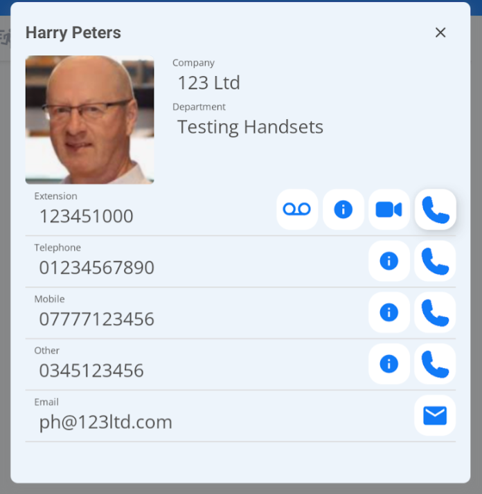 | It will then display the person's details, including the internal extension number. Press the dial button to copy the number to the keypad, and you are ready to dial. |