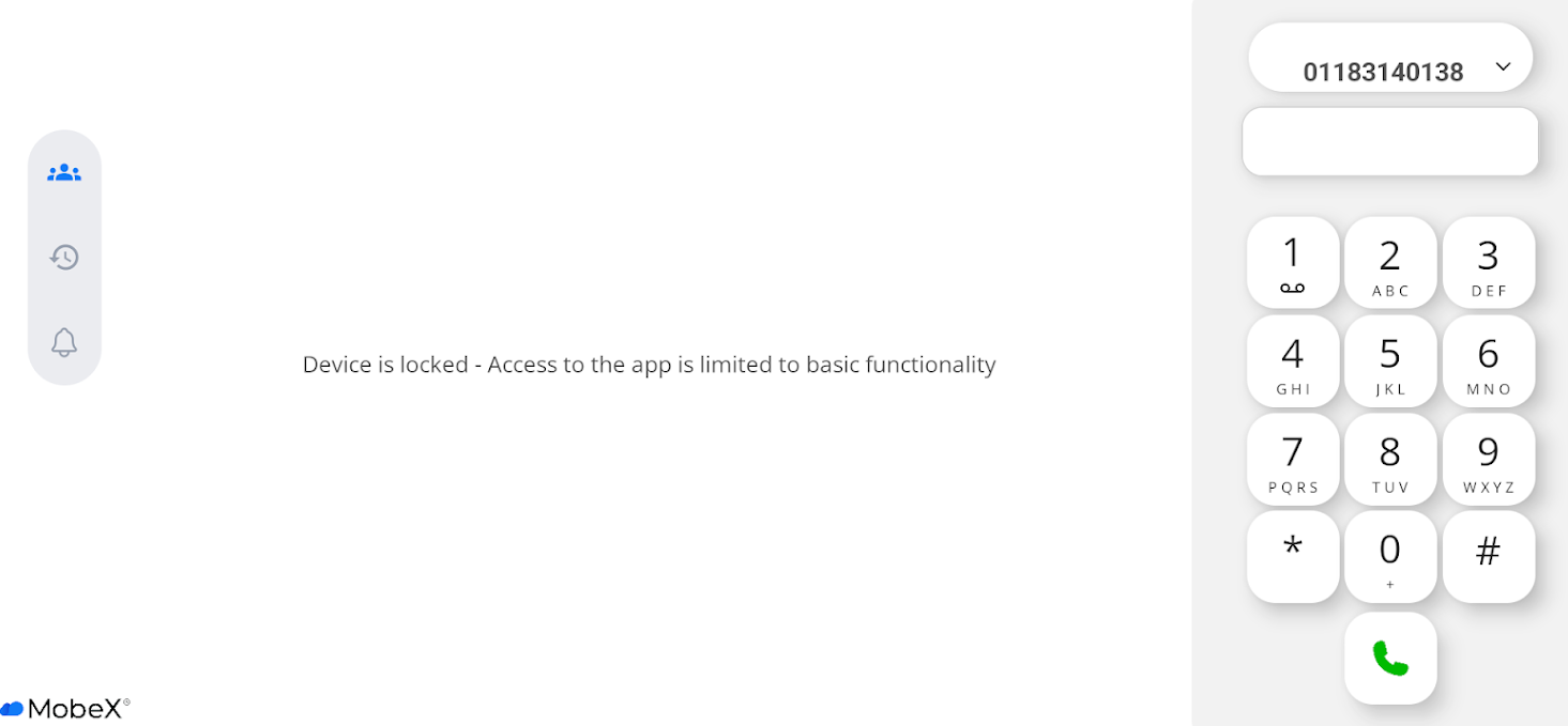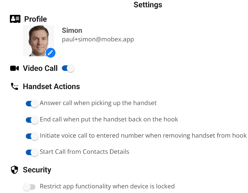 | To provide some extra security for the use of your handset. It is possible to restrict some features within the MobeX software. To enable and disable this feature first click on your picture avatar on the top right of the screen. | |