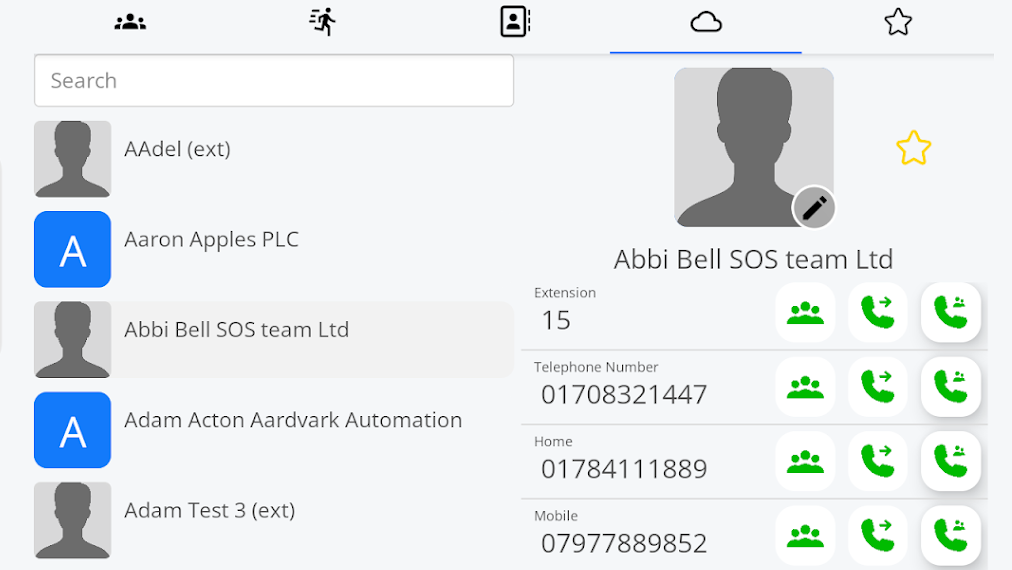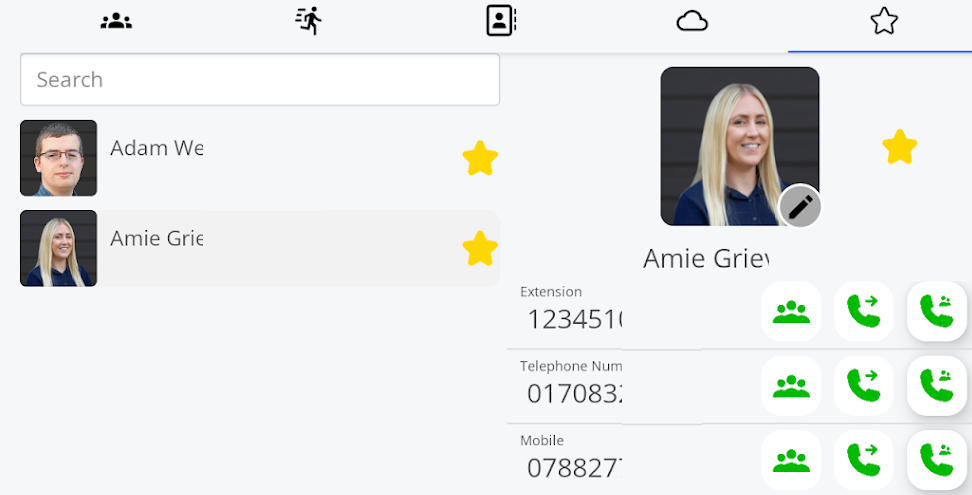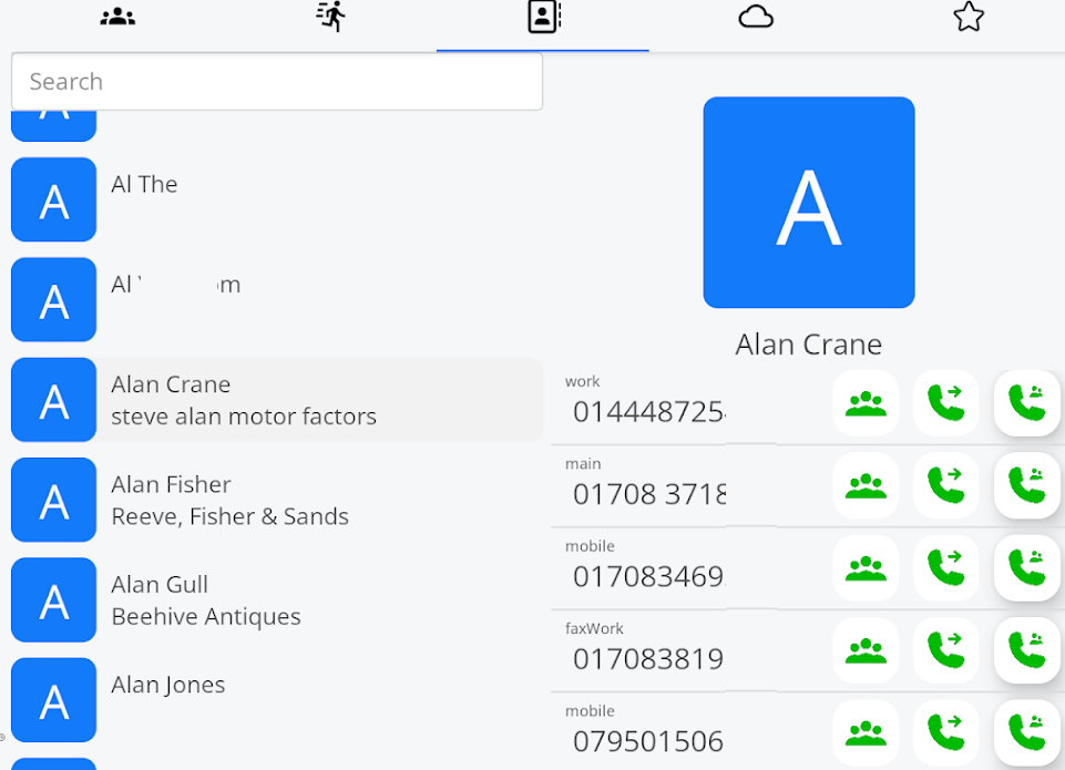 After pressing the transfer key, it places the first caller on hold, and their details will appear at the very top of the dialpad screen. You can then enter the number to which you wish to transfer the call. Select from your Presence tab, Local Phonebook, Cloud Phonebook or one of your contacts in your favourites tab if you know the number. |