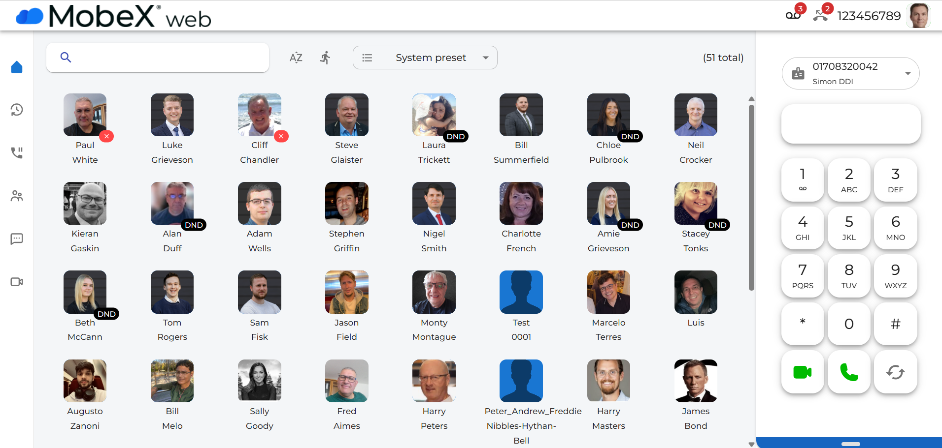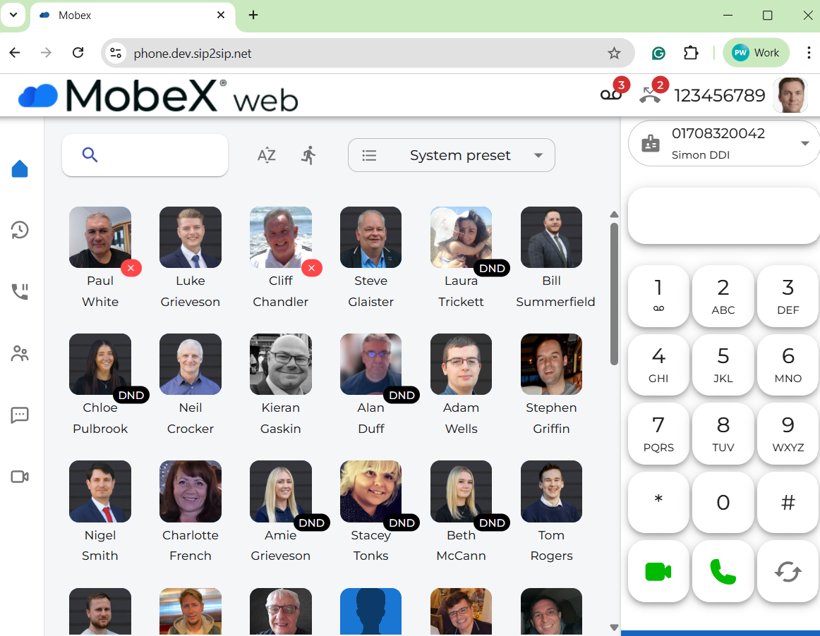 | The Home page gives a visual indication of your work colleagues. It allows you to see the availability of all other users on the system. Laura is in Do Not Disturb, and Paul is unavailable. |