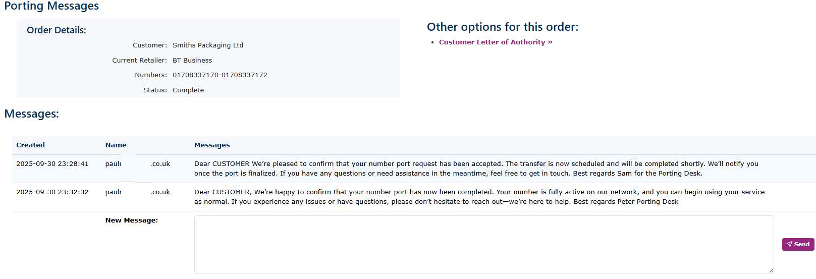 As the orders progress, you will get regular updates on the process. You can message the porting team with any additional notes.