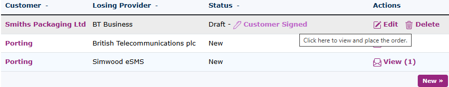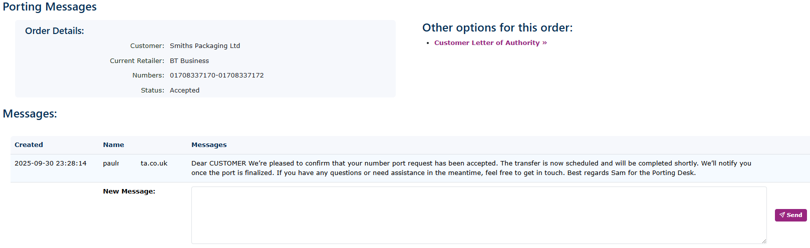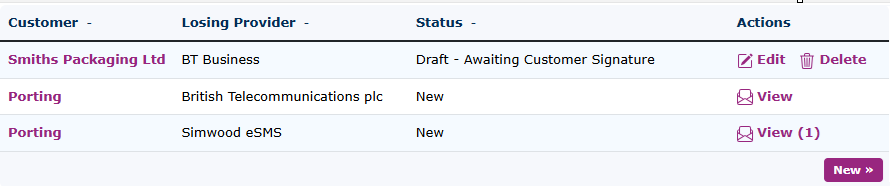 From the main page of number porting, you can see the status of the ports. You can see that 'Smiths Packaging' hasn't signed the port yet.