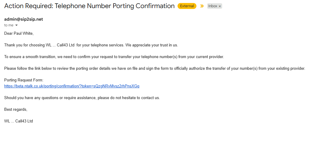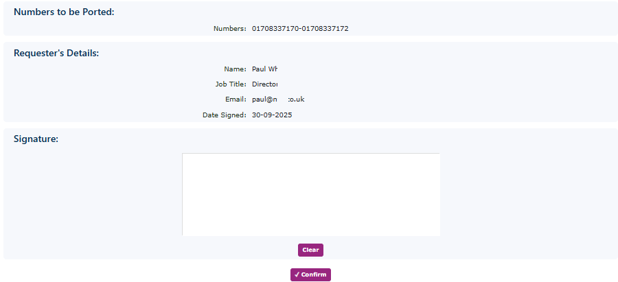 You need to get the customer to sign the porting request. Complete their details, and an email will be sent to them with a link to follow to authorise the port. You can also send the customer a link via SMS.