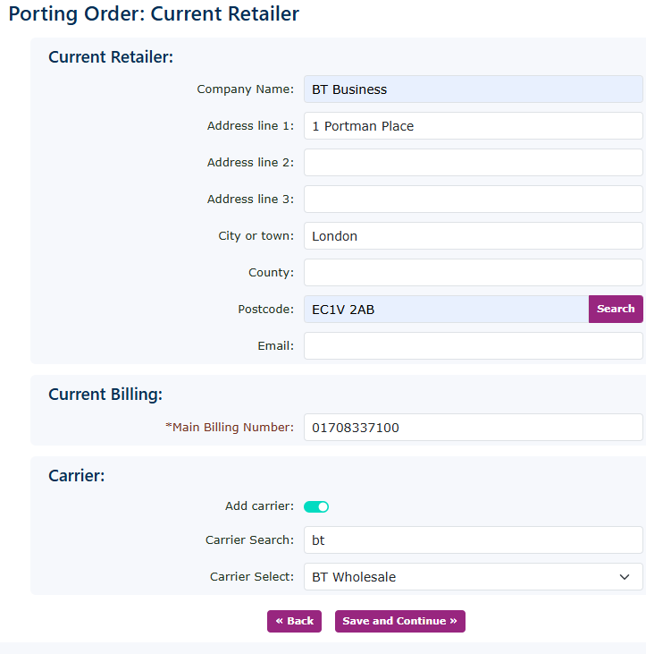 Complete all the current retailer information. Add the main billing number. If you have the information on the cattier, please add that to it, as it will help with the acceptance of the port from the losing provider. Click save and continue. |