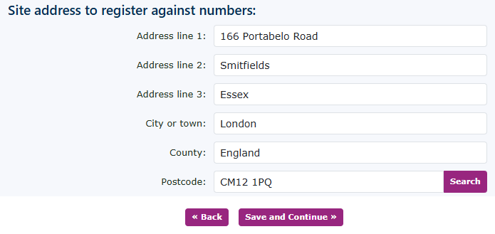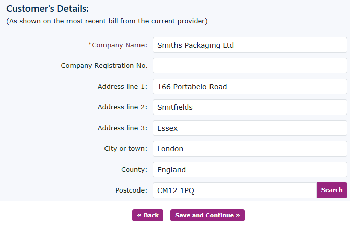 Populate all the customers' details here. If you have completed this for the customer record, it will self-populate again. If not, please complete all the required boxes. You can, of course, use the search box to find the address. Click save and continue. |