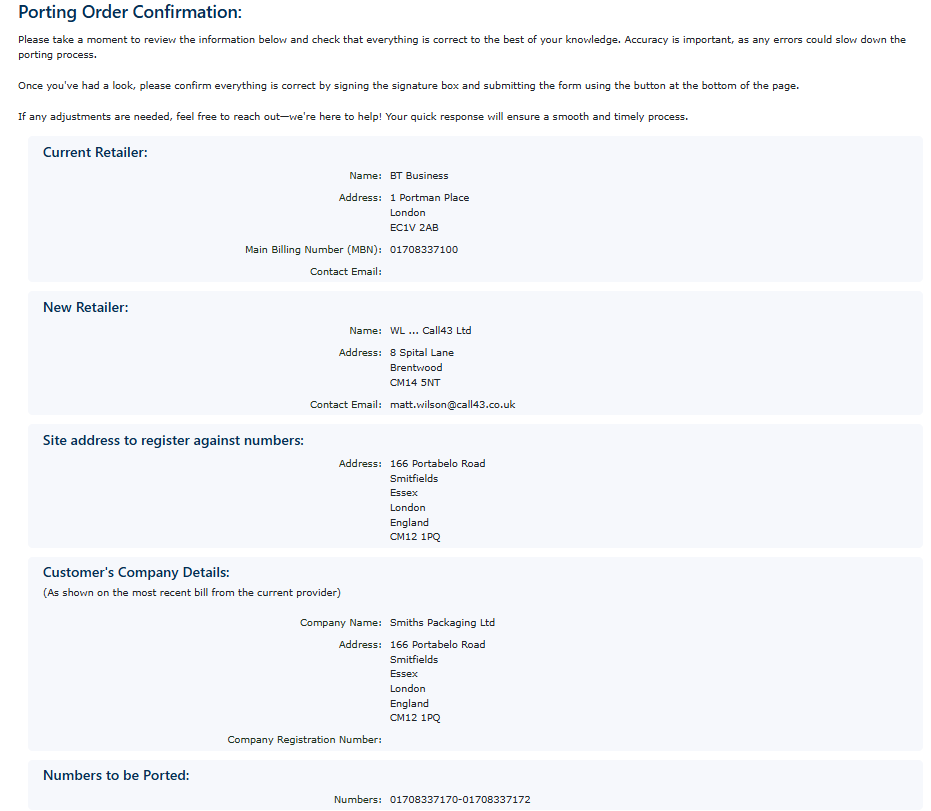 If you are authorised to sign the letter on behalf of the customer. You can select this option at the top. Be warned, some losing carriers request a copy of the Letter of Authority (LOA) and will not accept the signed document from the new supplier. If you wish to sign, then fill in your details at the top and sign the document.
