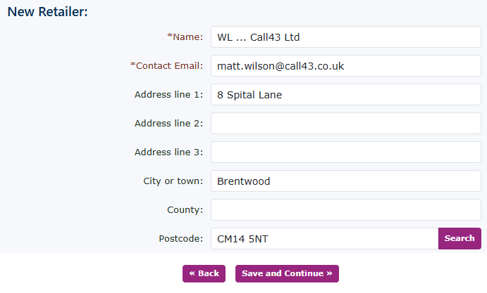 If you have already completed all your details in your own customer record. This will self-populate. If not, complete all the boxes for your address. Again, you can use the search option on the postcode to find the address (I would hope you know it). Click save and continue. |