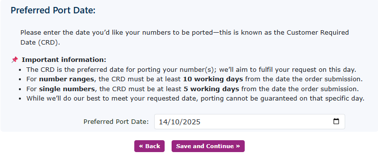 Please select the preferred port date. There is a recommended minimum date to ensure the port flows smoothly. There is some information above that should be taken into consideration. |