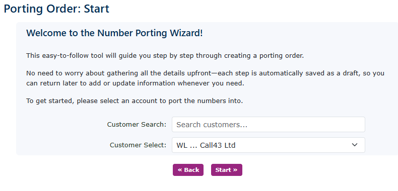Ensure that you have loaded the customer on the portal first, including all address details. It will make it easier to begin your port. Search for the customer you wish to port the number for or select from the drop-down box. Then click start. |