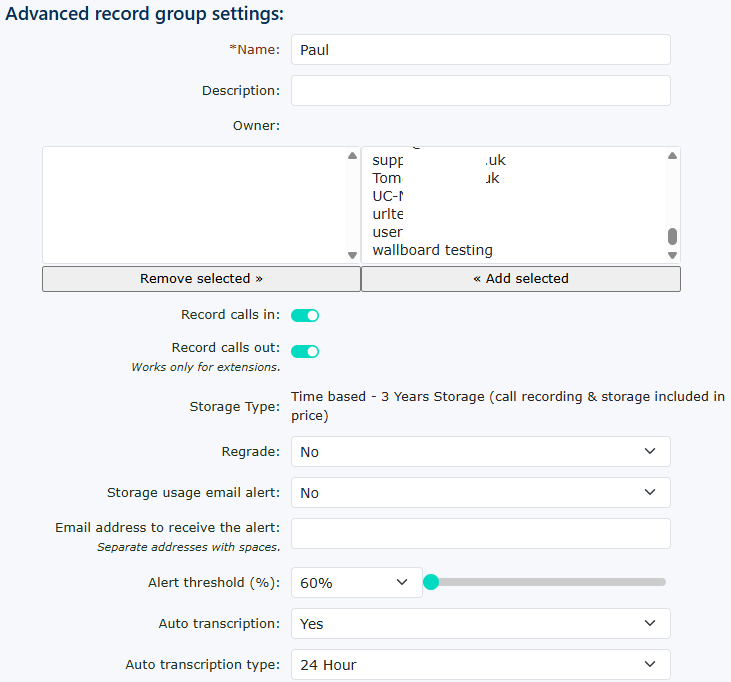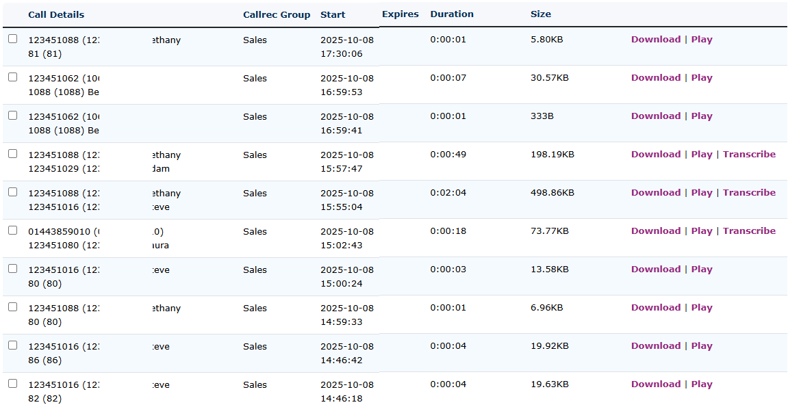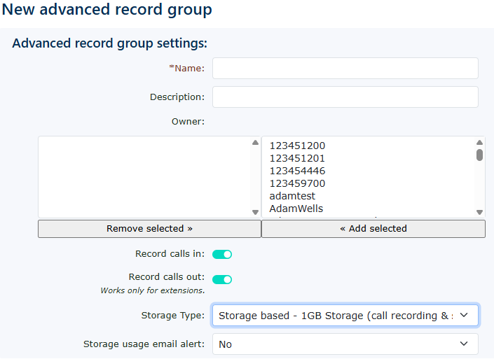 Call recording storage is based on storage size and free call recording. These may vary but will include the following 1Gb, 2Gb, 3Gb, 5Gb, 10Gb, 20Gb, 50Gb, 100Gb, 500Gb and 1000Gb. You can add any service to this group to record, such as Extensions, Hunt Groups, Queues, Feature Codes, & Numbers.