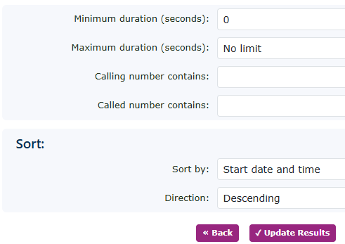 There are many options to drill down into the recordings you are looking for. You can choose a start and end date, a full number that was called, or a caller. You can even enter a partial number or an area code if you are looking for calls from or to a specific area. You can also display the results in order by time and date, call duration, and file size.