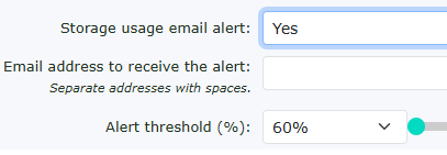 You can select when to receive email alerts informing you that the storage is at capacity. This can be set between 60% and 100% usage. |