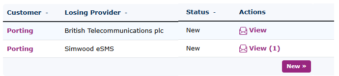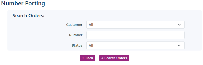 The number porting main screen consists of three main sections. A search box for finding and filtering your number ports | |