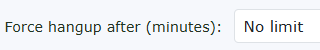 This option can be set to force the caller to hang up after the number of minutes set here. The default is set to no limit. |