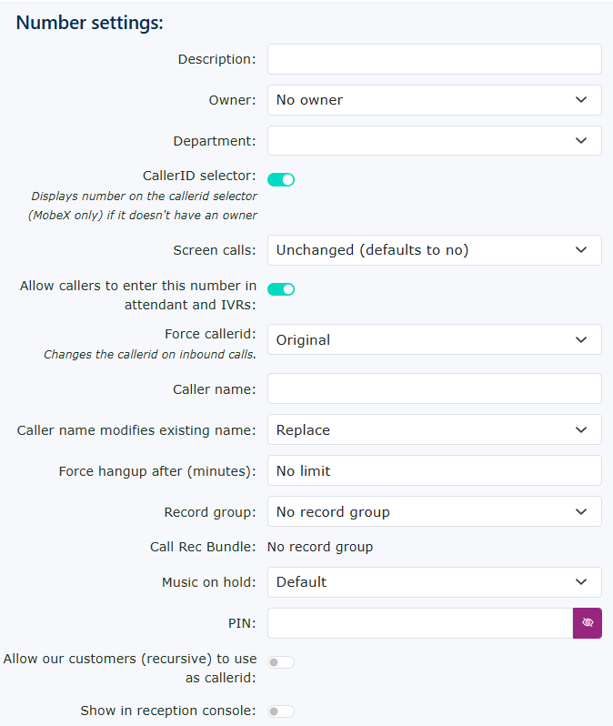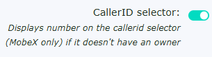 | This will allow any MobeX user to select this number from the drop-down in the outbound caller number on the MobeX software, providing the option above is set to no owner. If an owner has been selected, then only that owner will see the number in their Mobex software Caller ID drop-down selector. If it has been disabled, it won't be shown, not even if an owner has been added to the number. | |