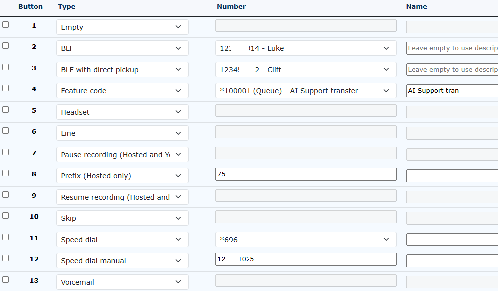 Selecting the custom settings under BLF settings ‘BLF Provisioning’ will allow you to add buttons at the bottom of the page. These buttons will auto-populate onto a branded hosted handset and/or MobeX if you use the MobeX web desktop or MobeX+ mobile app. We recommend not showing the BLF idle LED, leaving this set to ‘No', and leaving the monitor with your own extension set to ‘No’. This is because it stops your handset from lighting up with lots of lights and informs you that the handsets are plugged in and ready to receive calls, which in most circumstances are not required. The lights used on a handset to show status are generally red and green. Green shows that the handsets are available in the case above, and red shows that a user is busy. Some people are colourblind, making it impossible to see what is happening with the BLF when this mode is in use. Not selecting to monitor your Extension means it will not populate a button on your handset, freeing up a button to be used for another telephone Extension. |