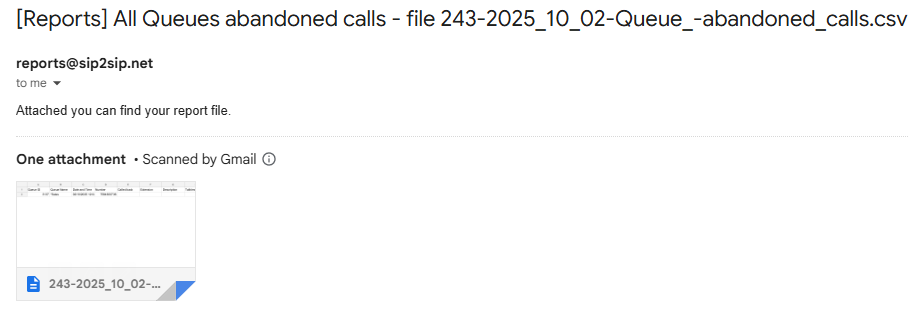 Reports will be emailed with the name of your report in the subject box. In this case, below was called All Queues abandoned calls and the report type is Queue_-abandoned_calls. |