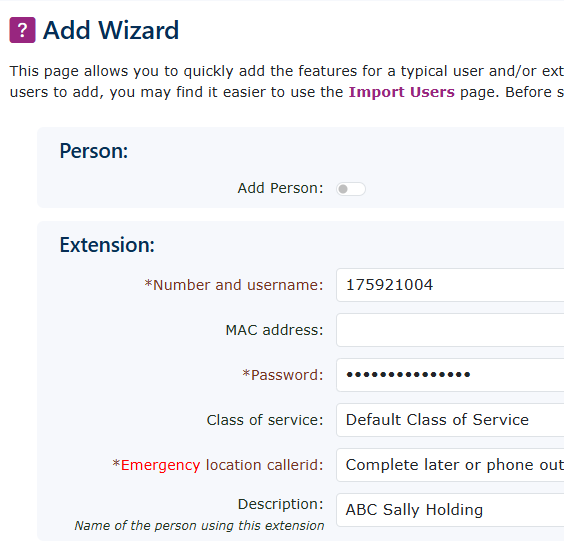 Use the add wizard tool by going to Features, then Add Wizard. You can add the details you see, but again, the most important one to enter is the Description (name of the person using this telephone extension)