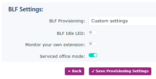 At the bottom of this page, under BLF Settings, set the service office mode to On, then click Save Provisioning Settings. |