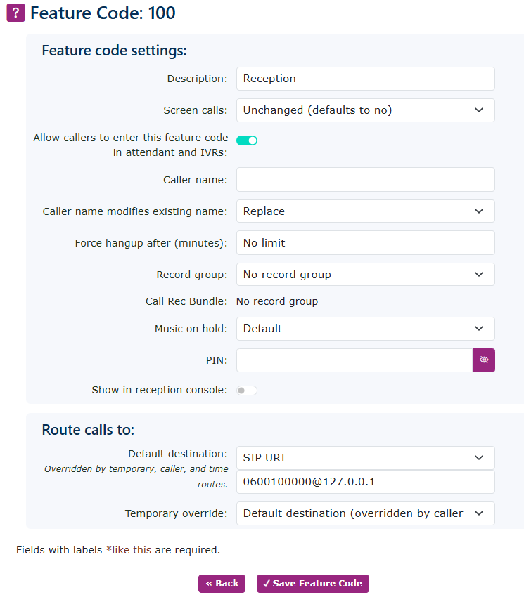 Give the Feature code a number; we recommend 100, as it can also serve as the call number if a tenant wants to call reception. Then add a description, again we recommend ‘Reception’ and finally the destination for this feature code. This needs to be something a little unusual. Set this to a SIP URI in the drop-down menu and enter the pilot number like below 0600100000@127.0.0.1